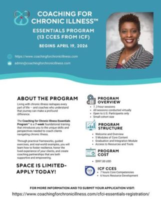 Applications are open for the Coaching for new Chronic Illness Essentials Program™, a 7-week foundational experience for coaches who want to support clients living with chronic illness with clarity, care, and confidence. This program was designed for new, intermediate, and seasoned coaches who know that their clients need more than motivation or productivity tools and want guidance on how to coach responsibly without crossing into medical or therapeutic roles. Program Structure. Seven 2-hour live virtual sessions in a small cohort including: Welcome Module; 5 sessions of core content; and a Graduation and integration module. What You Will Gain: A clear framework for coaching chronic illness clients; Access to thoughtfully designed coaching tools and resources you can immediately integrate into your practice; and a supportive, discussion and reflection-based learning environment. Currently open to participants in the United States only.